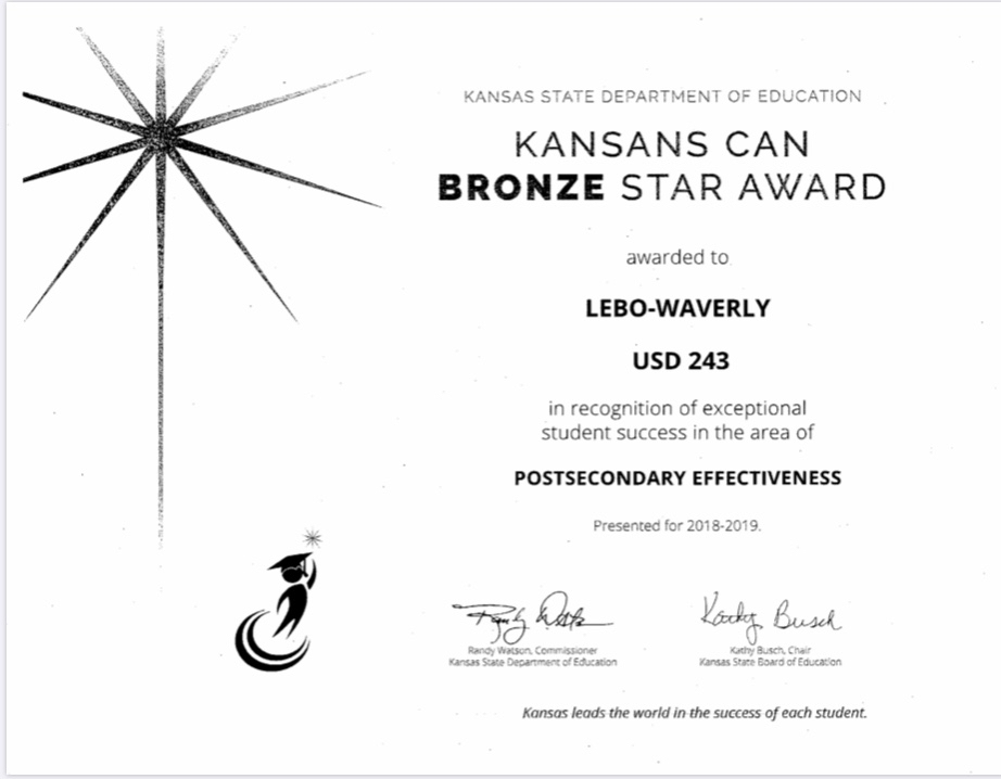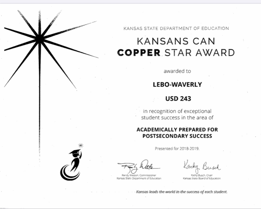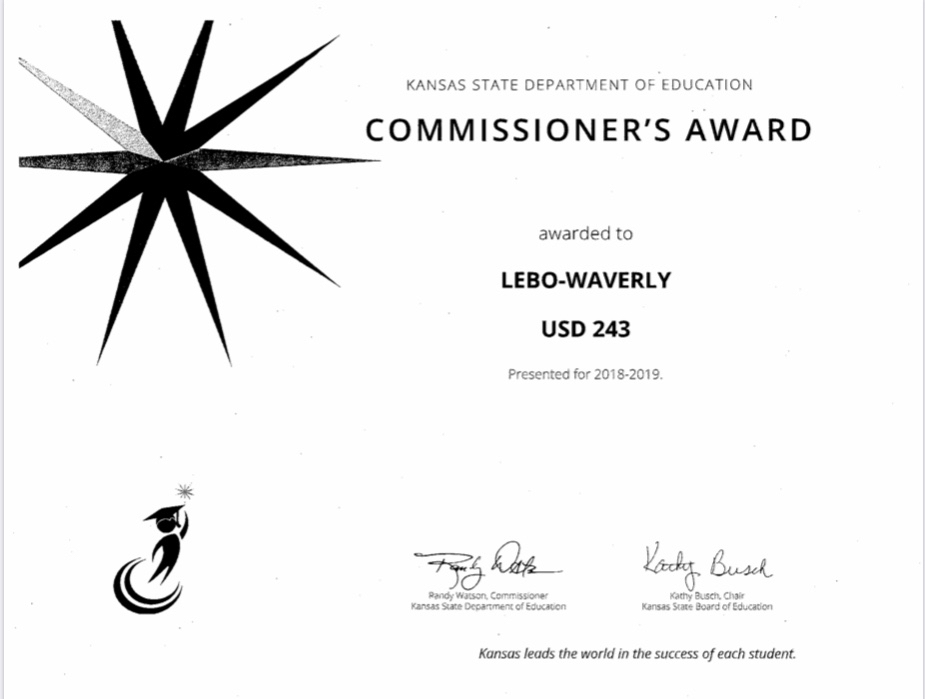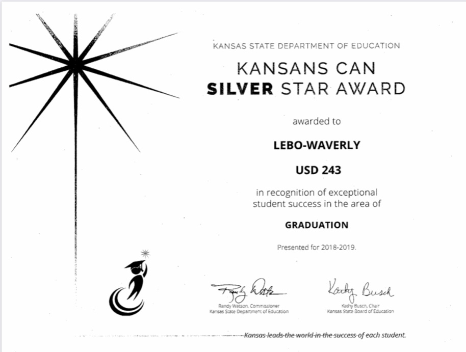 It is with great pride that we share with you that USD 243 received the following recognitions regarding our academic success. USD 243 received the following STAR Recognitions from the Kansas State Commissioner of Education: 1. Commissioner's Award 2. Graduation Rate-